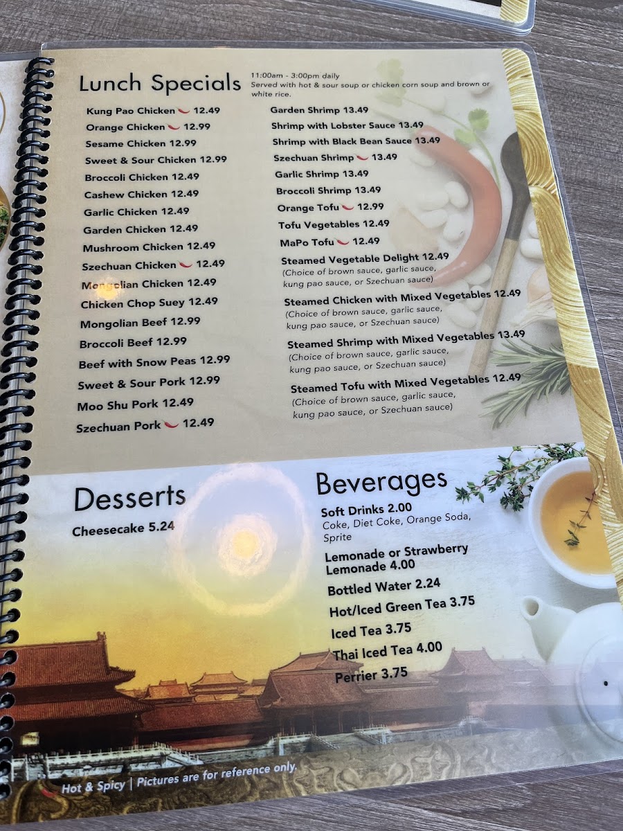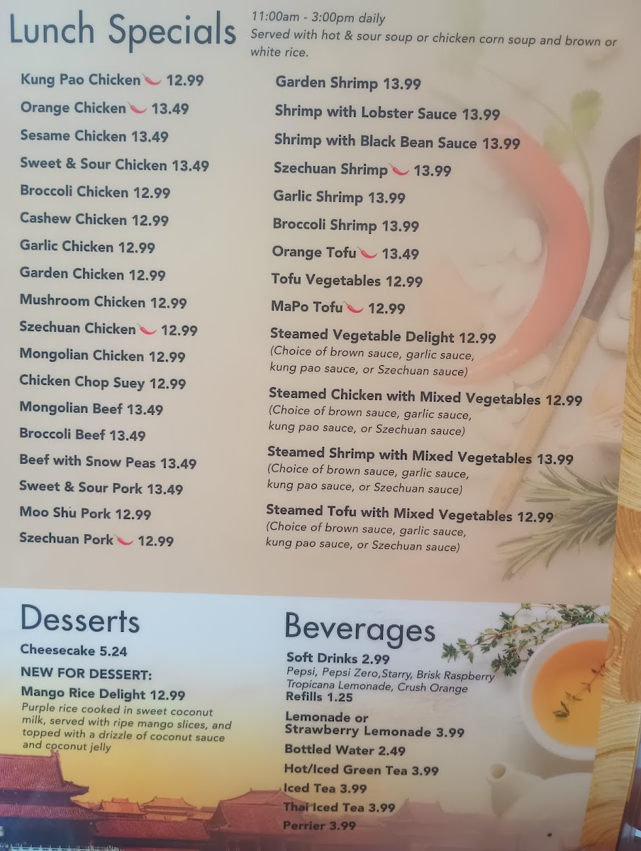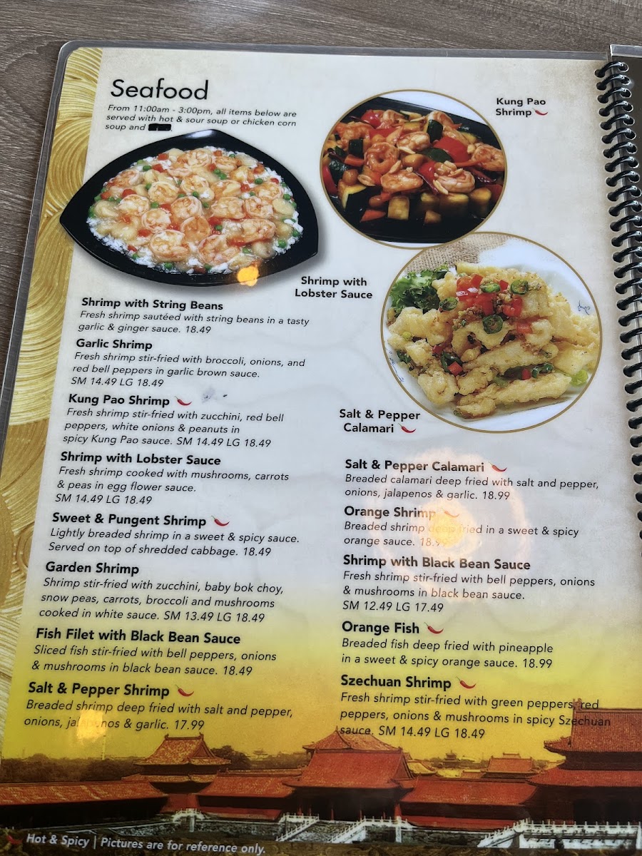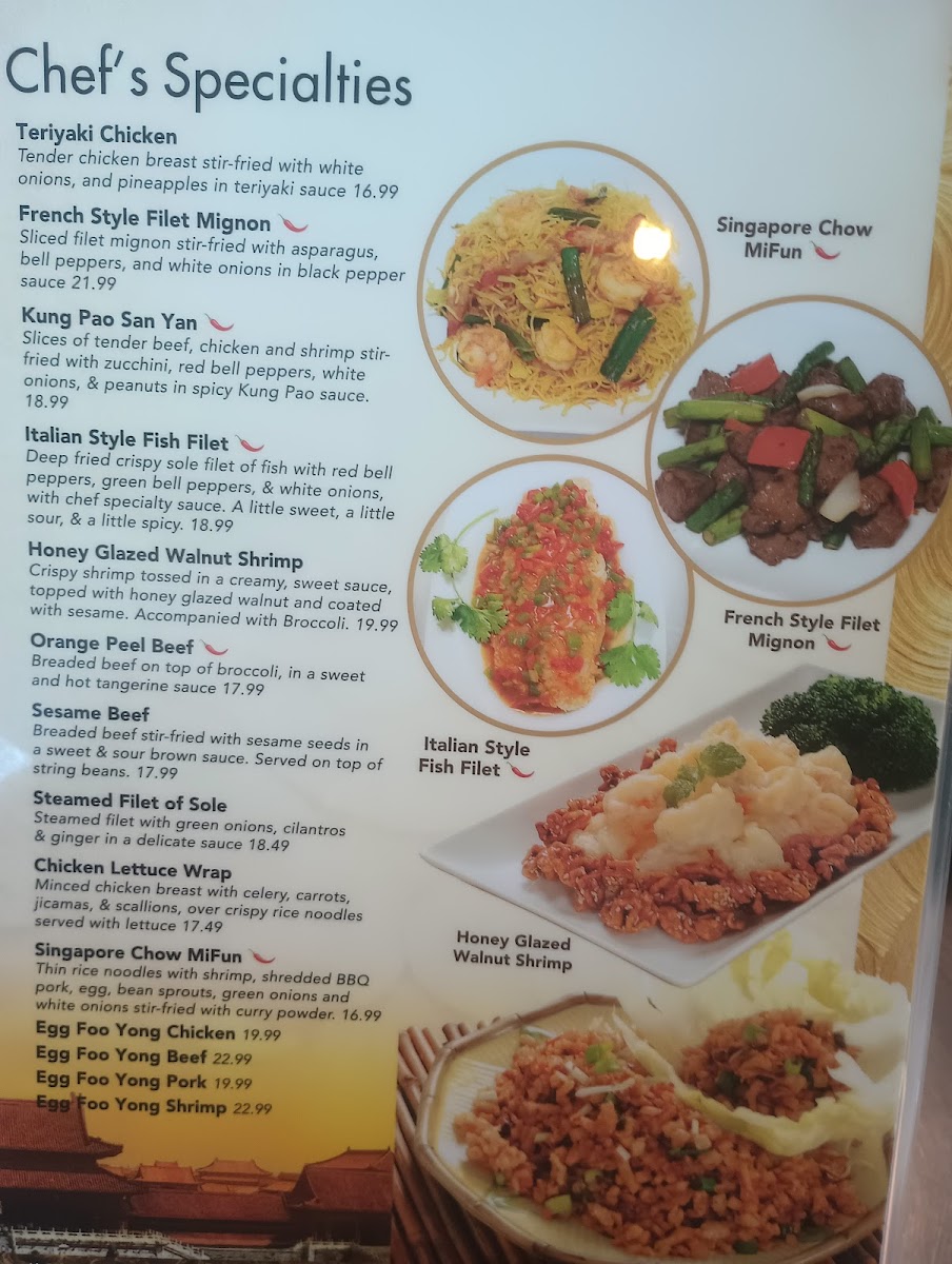 Slices of tender beef, chicken, shrimp, stir fried with zucchini, red bell peppers, white onions, and peanuts in spicy Kung Pao Sauce.