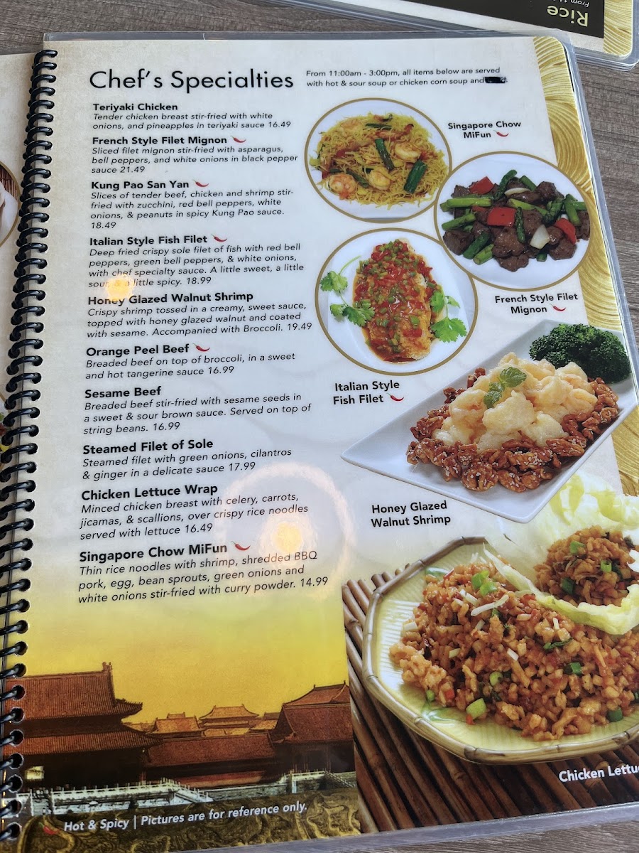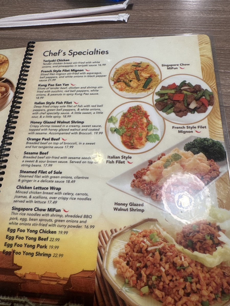 Deep fried crispy sole filet of fish with red bell peppers, green bell peppers, and white onions with chef specialty sauce. A little sweer, a little sour, and a little spicy.